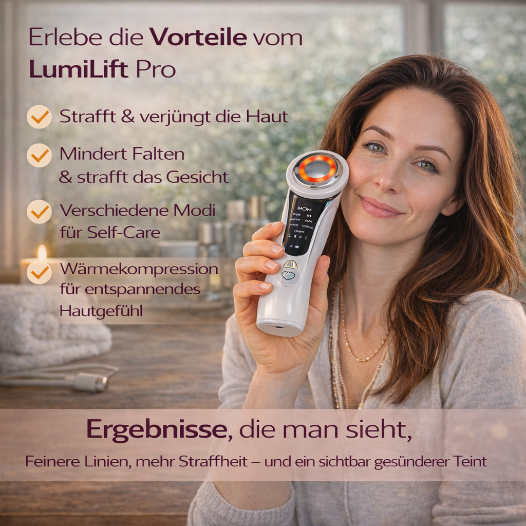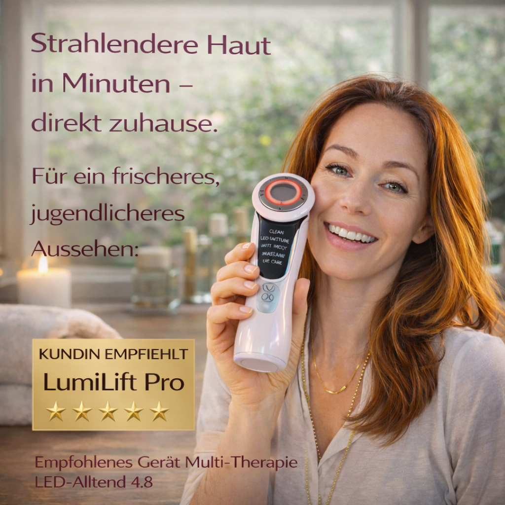 LumiLift Pro kombiniert EMS, LED-Licht und Wärme in einem Gerät. Im Gegensatz zu anderen liefert es sichtbare Straffung, tiefere Reinigung und echte Augenpflege in wenigen Minuten täglich.