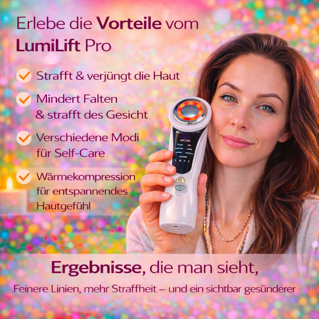 LumiLift Pro kombiniert EMS, LED-Licht und Wärme in einem Gerät. Im Gegensatz zu anderen liefert es sichtbare Straffung, tiefere Reinigung und echte Augenpflege in wenigen Minuten täglich.